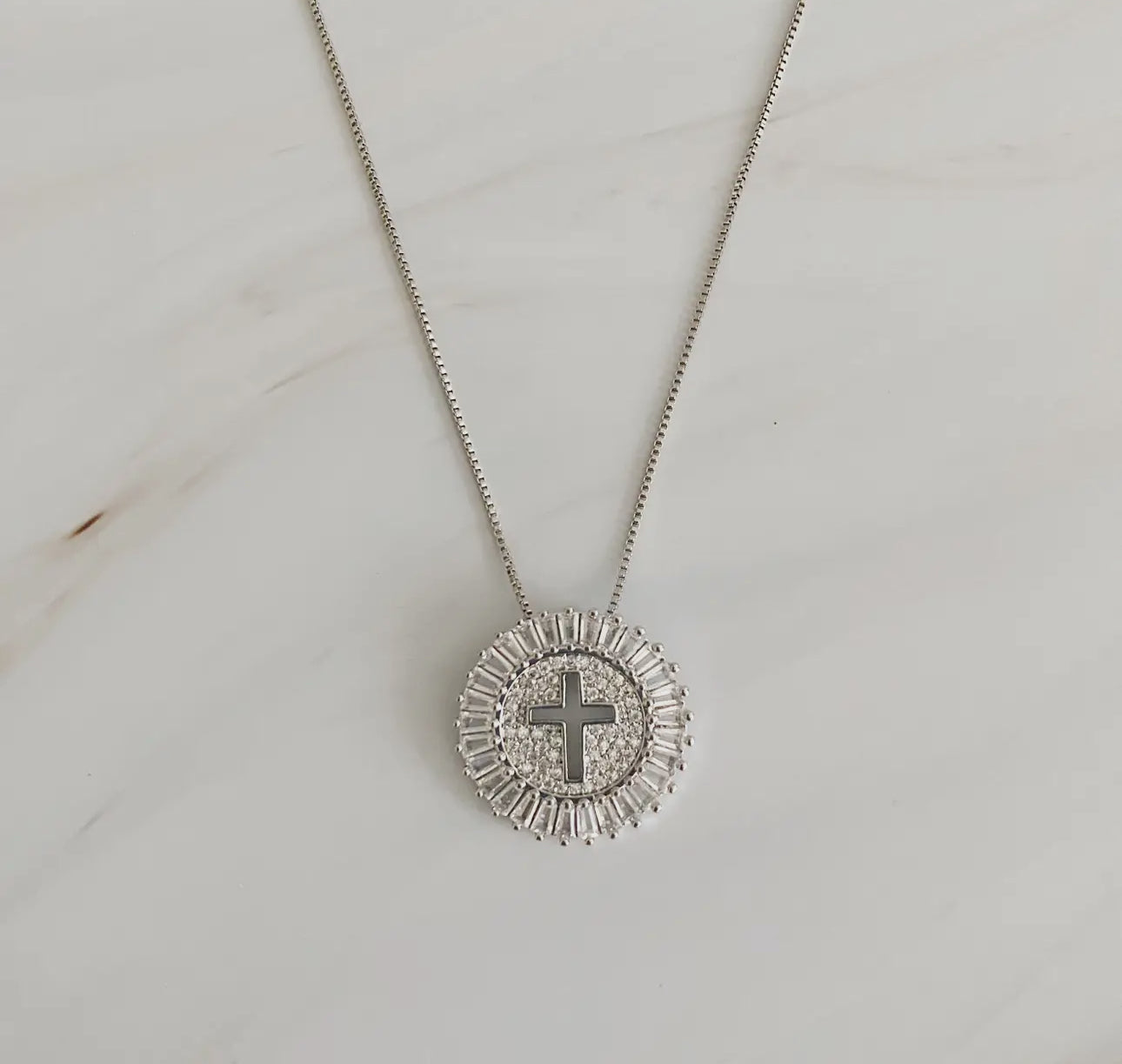 Gorgeous necklace with cut out cross in sparkly round charm.